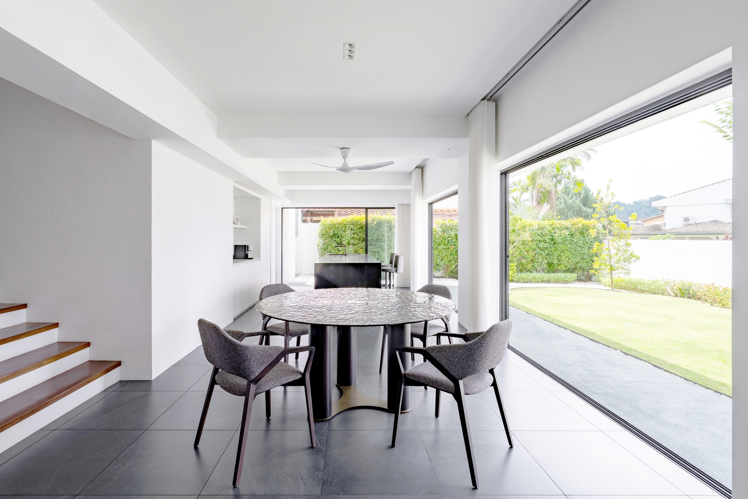 The open dining and dry kitchen area features large floor-to-ceiling glass doors that open up to the garden, seamlessly blending the indoor and outdoor spaces.The wet kitchens and store are tucked behind the open area next to the party wall, out of sight.The existing staircase was then widened into mini ‘amphitheatre’-like steps, creating a sense of expansion between spaces while allowing seating and views to the garden.The space then flows and extends toward the garden, forming a new double-volume space that becomes a room in a garden – with views to the front and rear.
