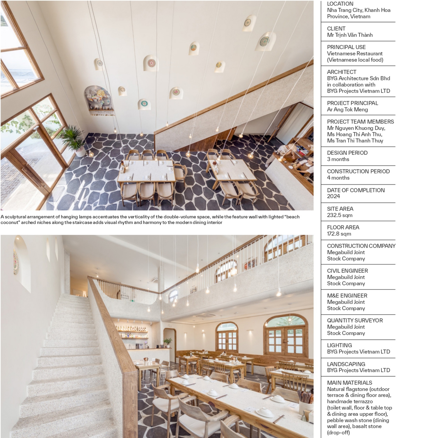 Together, these materials-natural flagstone, handmade terrazzo, pebble wash stone, basalt, and sand-textured finishes-form a narrative of place and atmosphere.They offer guests a setting that is not only visually striking but emotionally resonant, connecting the act of dining with the spirit of Nha Trang’s natural and cultural landscape.