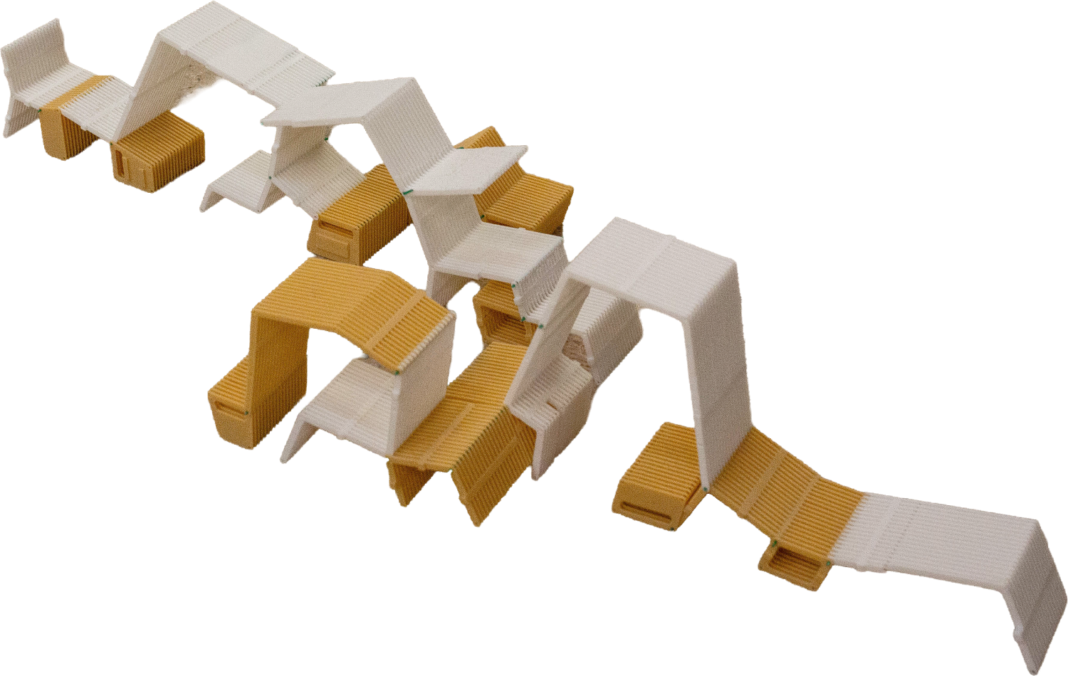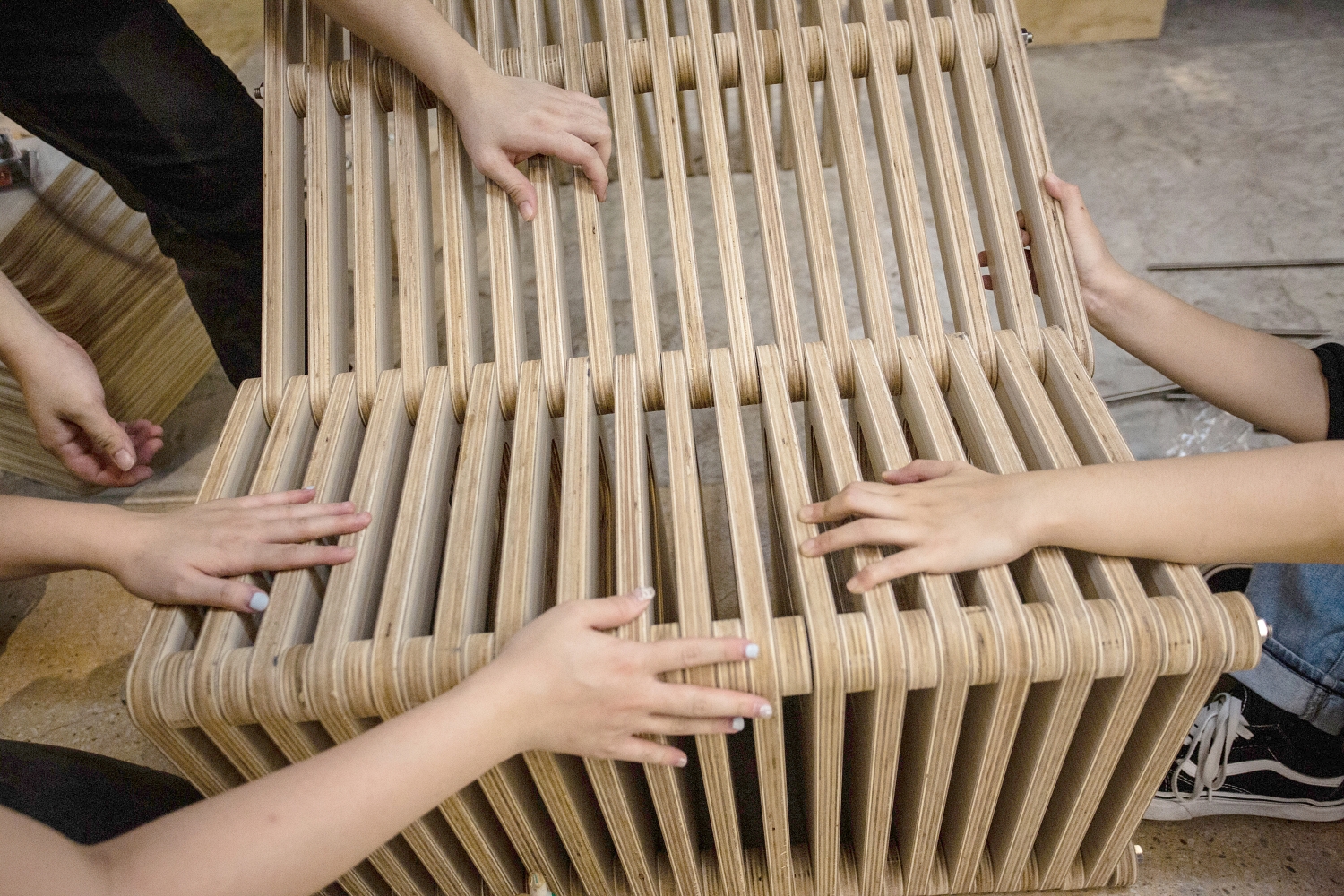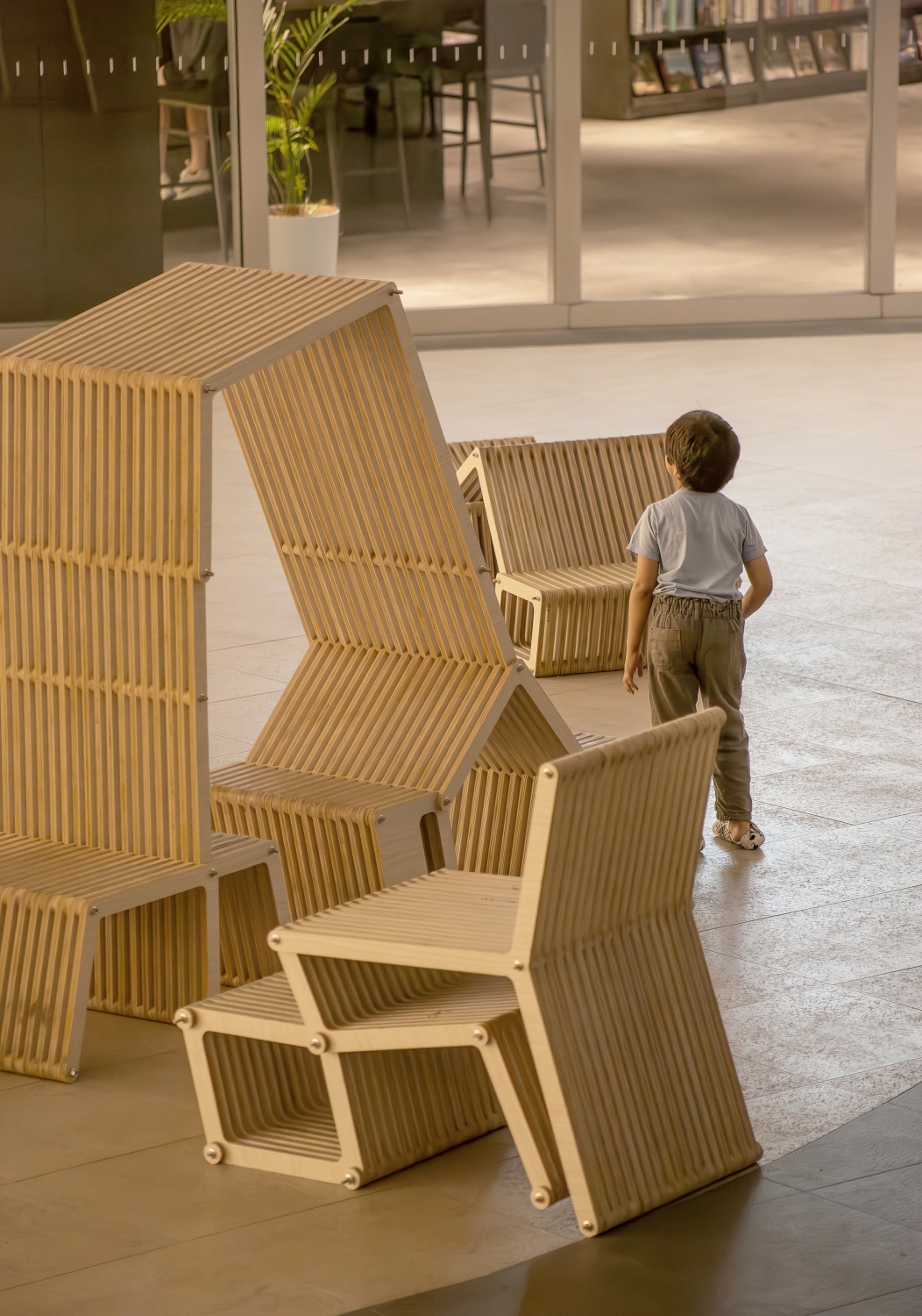 witching to plywood offered a more workable solution. However, sourcing the right quality required extensive collaboration with local suppliers. Initial samples from carpenters were inconsistent, prompting direct engagement with manufacturers to ensure precision in CNC cutting. The design ultimately evolved to utilise standardised 4’ x 8’ plywood panels as its fundamental building blocks. The design was meticulously planned to ensure zero waste. Every cutout is repurposed into functional components. These modular pieces interlock in countless configurations, allowing for benches, partitions, and social hubs that adapt to different contexts. Its components are crafted to fit together in countless arrangements, enabling endless spatial variations while maintaining structural coherence.The use of bolted connections ensures quick and intuitive construction, allowing even those without technical expertise to assemble, dismantle, and reconfigure the pavilion with ease.