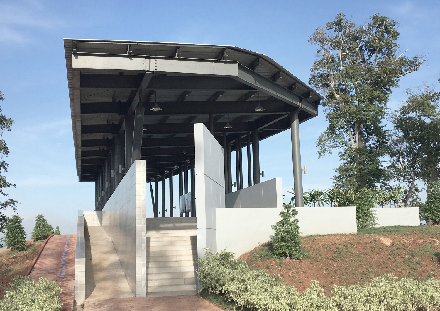 The Viewing Deck, in the Facilities Hub, is a special structure for welcoming guests or as a viewing spot. It is also used for banquets during festivals. Its shape is inspired by a swallow’s tail, stretching out from the slope toward the Hydro Dam and the Mekong River. All the bricks used within this construction are made of iron-rich black mud dug out from the river basin. The bricks were formed on site and dried naturally before being applied as an infill wall material.