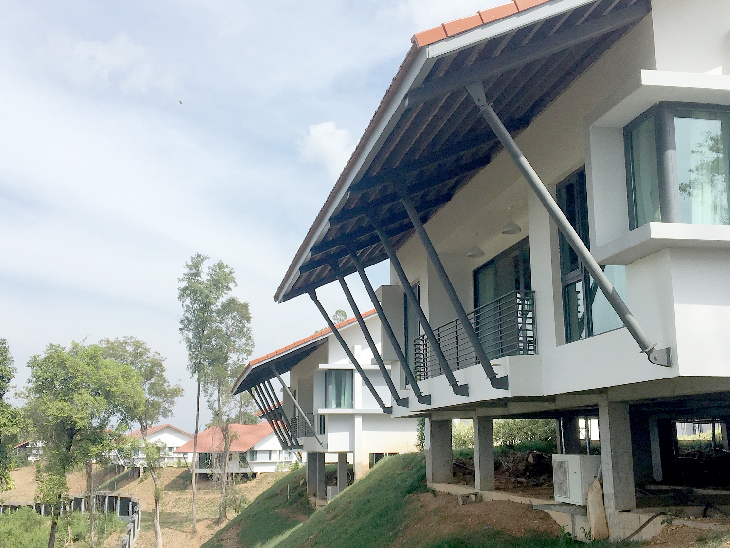 Roof overhangs are exaggerated to shed the villas and structures from regular heavy downpours, as well as to discard tree leaves that may gather on the roofs. The rainwater runoff is collected in an On-Site Detention Pond before being redistributed to water the landscape, especially during the dry season.