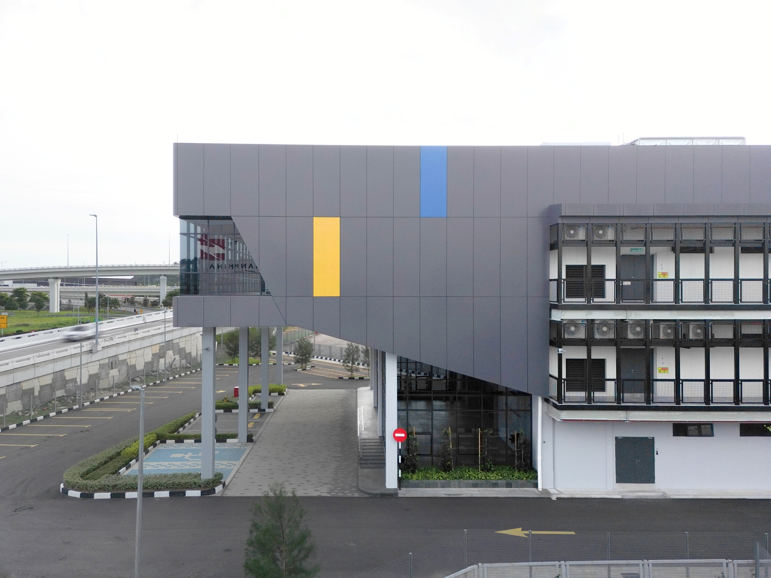 The building’s long, linear footprint, a direct response to its site constraints, is nevertheless impactful. Aesthetically, it makes up for lost frontage by packing a colourful punch. In a sea of plain white and faded grey buildings, GBS TechSpace stands out with its bold dark grey aluminium composite panels. Splashes of blue and yellow celebrate Penang’s state colours. With high visibility via the flyover descending from the second Penang bridge, GBS TechSpace is well poised as a welcoming symbol of Penang’s identity as an industrial hub.